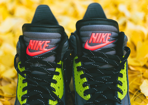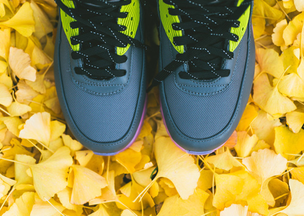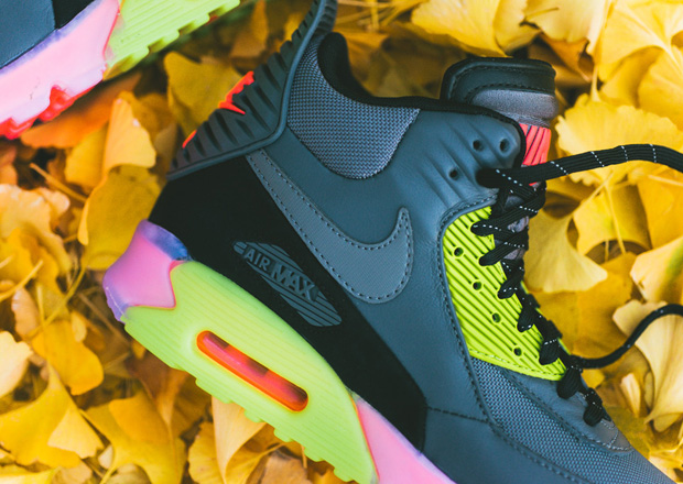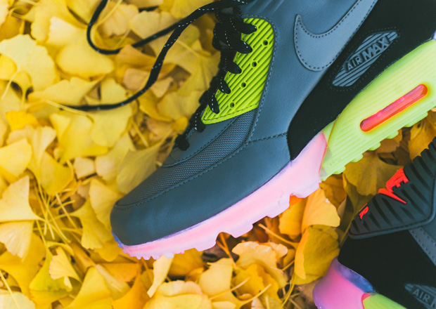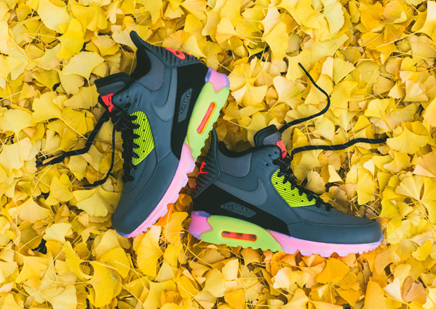 Nike Sportswear marches on with new looks for this season’s sneaker/boot hybrids, including this hot new version of the Air Max 90 Sneakerboot ICE in Grey and Hyper Punch. The beefed up, iced out and inclement-weather-ready iteration of the legendary Air Max 90 gets a Dark Grey leather and ballistic mesh upper with detailing in black, then accented with bright pops of Hyper Punch and Fierce Green—including each vibrant hue within the icy translucent sole unit. Get your feet equipped for winter and head to select Nike Sportswear retailers like Sneaker Politics to pick up your pair now.