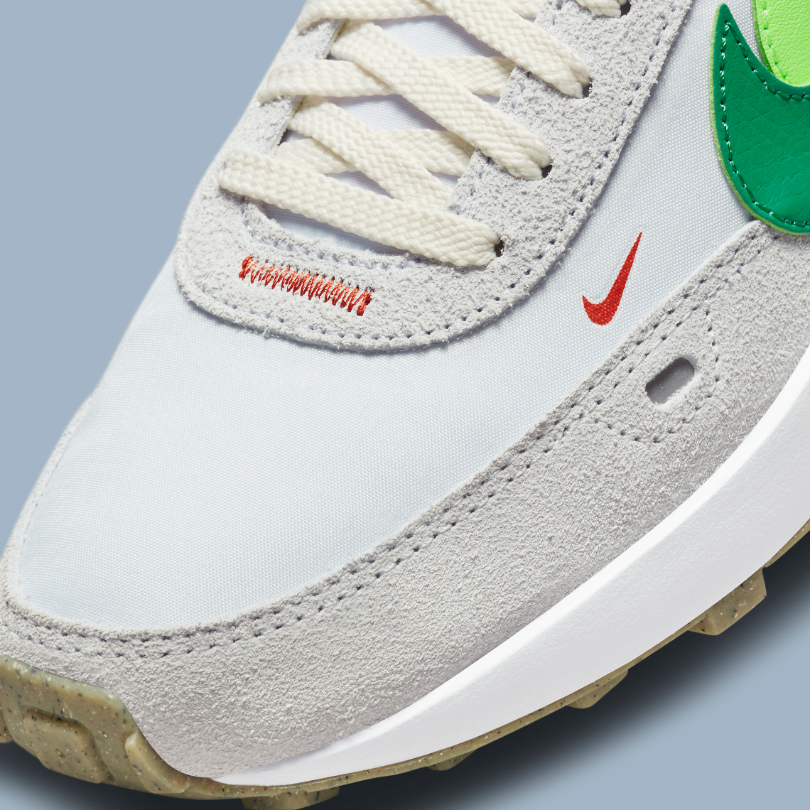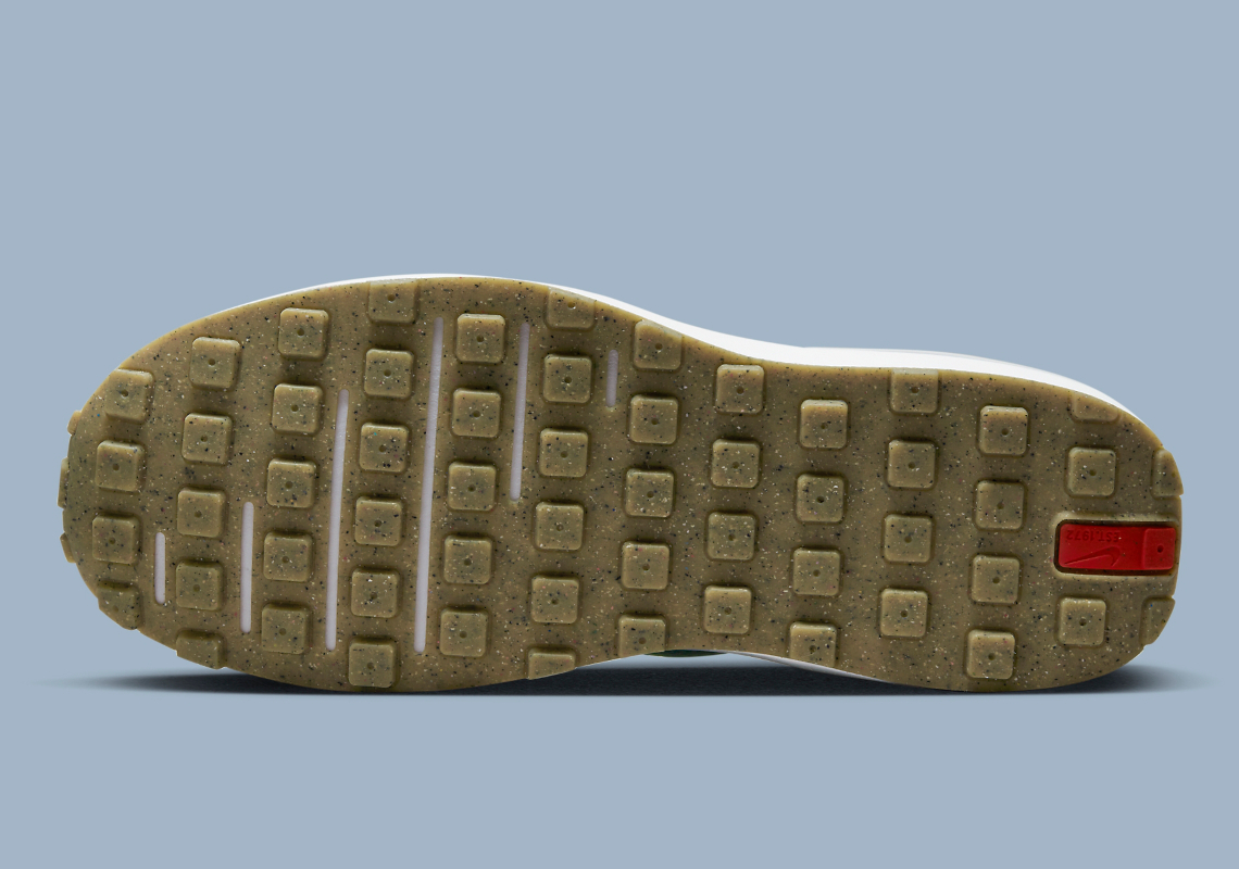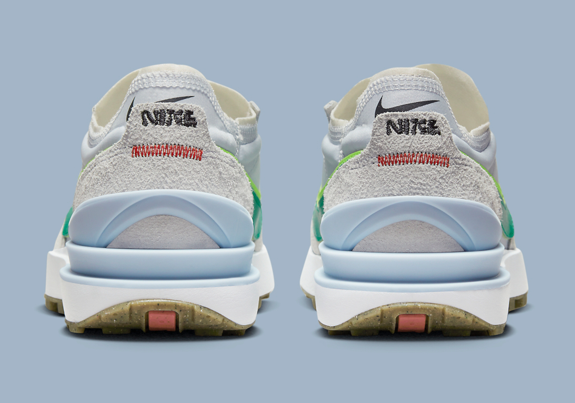A mostly greyscale arrangement covers the bulk of the sneaker’s base layer, with shades of green animates the sidewall’s logos. Miniature swooshes at the lateral quarter panel work in-tandem with the exposed stitching around the tongue to introduce a contrasting red to the vintage-inspired design. Molded structural components at the heel deviate from their surroundings in a soft blue, which injects a summer-readiness into the shoe. Lastly, the sole unit keeps things simple, with the partly-recycled waffle-patterned tread indulging in a tan makeup.