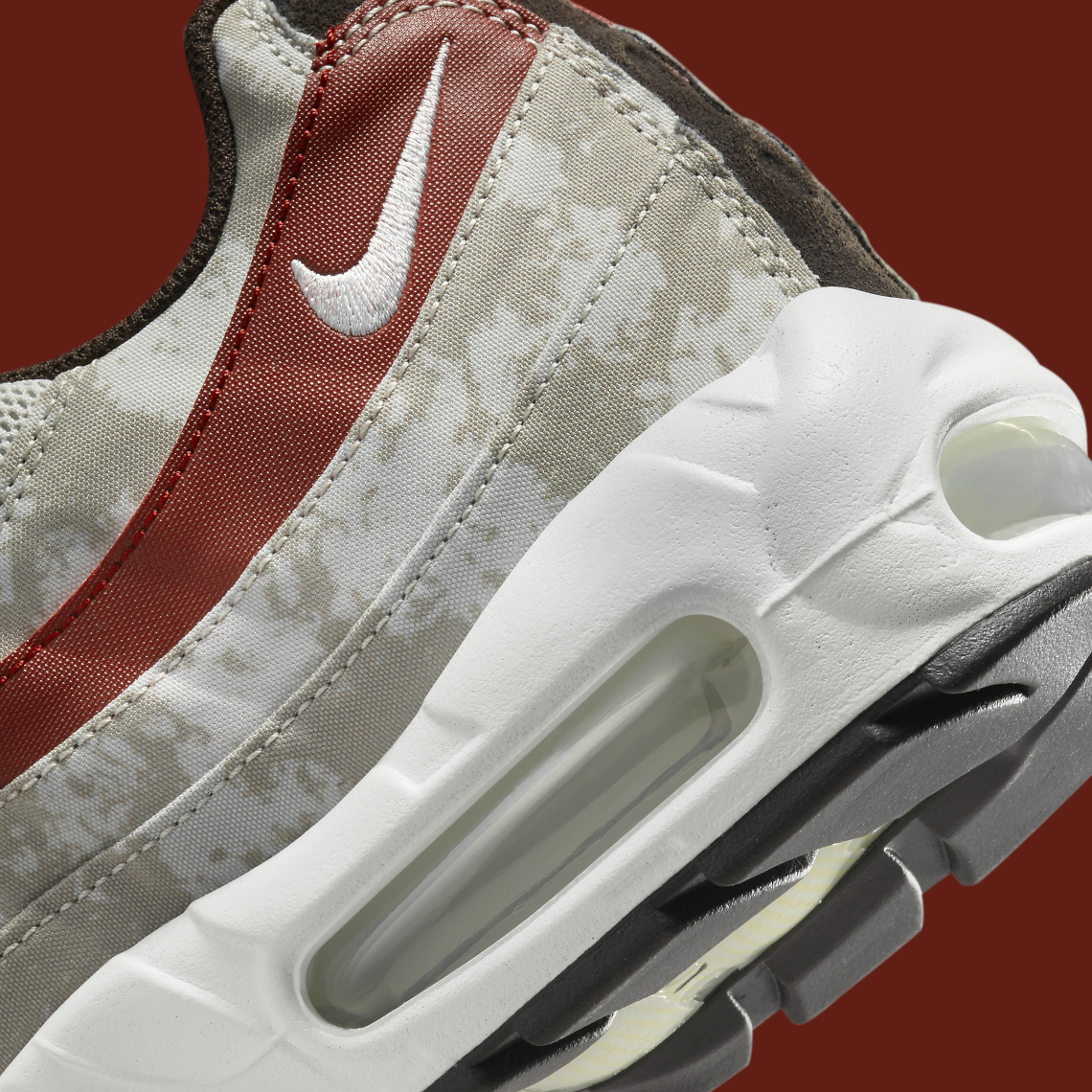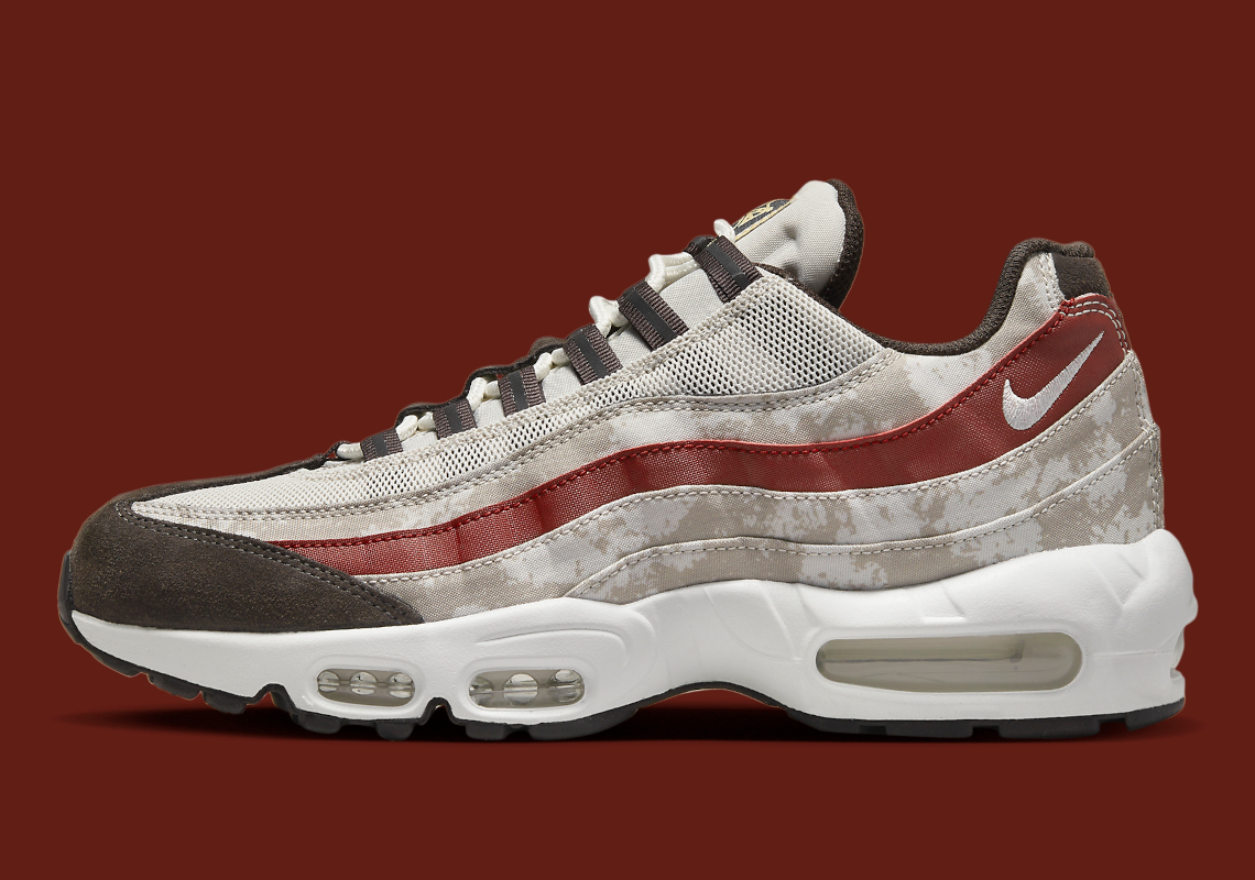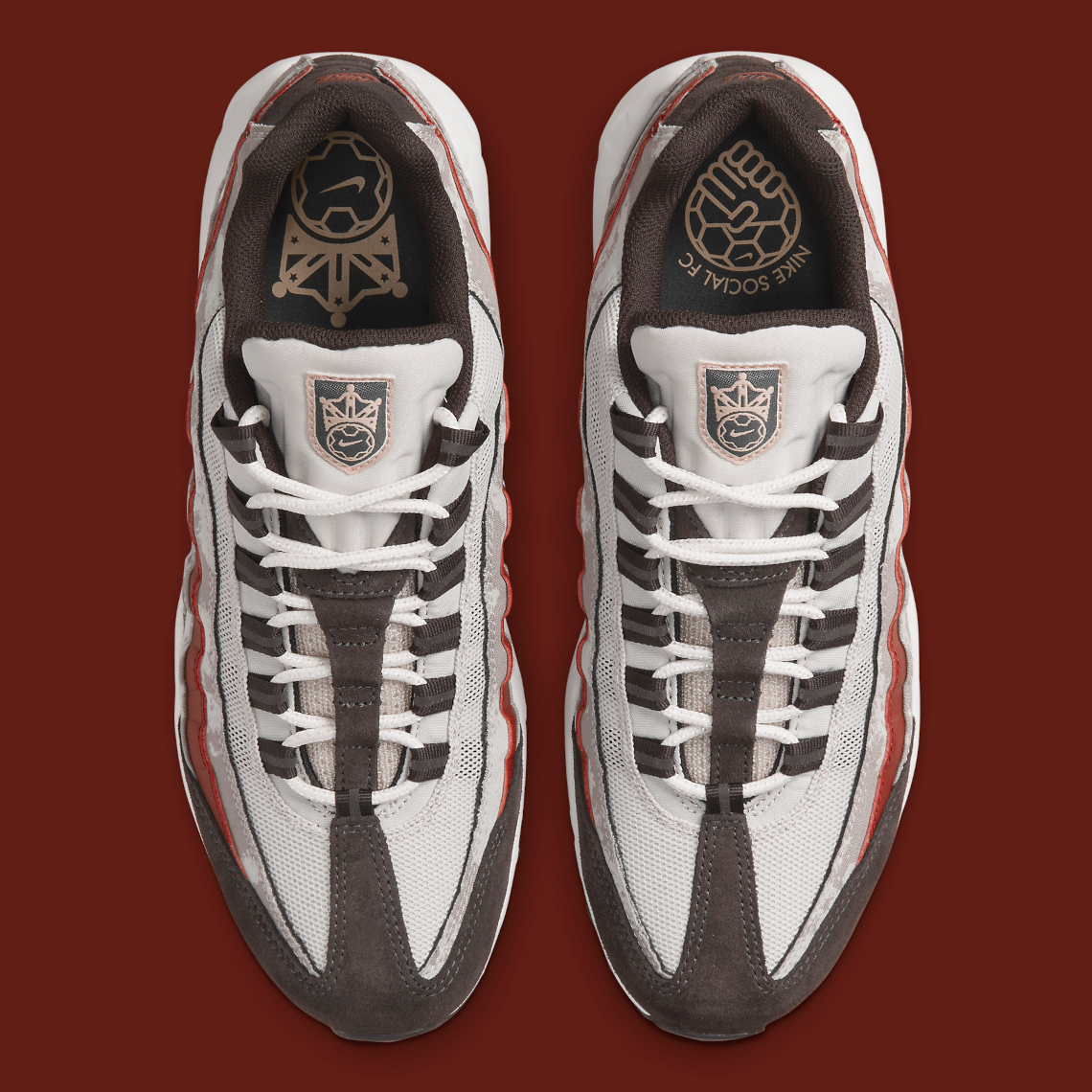 Ostensibly part of a larger Nike Sportswear collection dubbed “Social F.C.,” the newly-surfaced pair indulges in varying shades of brown interrupted with an eye-catching muted red-colored canvas vamp overlay running the length of the profiles. Dark chocolate-reminiscent suede toe caps and lace loops play supporting roles to the blotch pattern that dominates the remainder of the sneaker’s upper, as well as to the football club crest-like emblems on the top of the tongue and right sock-liner. Underfoot, the Air Max-accompanied cushioning system opts for an understated white and black color combination, allowing for the top-half to revel that much more in the spotlight. While the Air Max 95 may not be optimal footwear with which to play the sport, it’s more than viable as an option to head to a game in, or to travel back home after a match. Track suit sold separately, of course.
