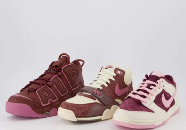 Nike Sportswear propositions inspired by the February 14th holiday aren’t new. The upcoming bunch – consisting of at least a Nike Dunk Low, Air More Uptempo and Air Trainer 1 – continues to rely on obvious color combinations associated with the most romantic day of the year, donning wine-reminiscent reds, spring-appropriate pinks and soft whites across a mix of leather, nubuck and suede materials. No heart motifs are visible on either of the three pairs, at least according to the angles available at the moment, but it’s possible that included accessories and shoe boxes indulge in traditional imagery for the day of love.