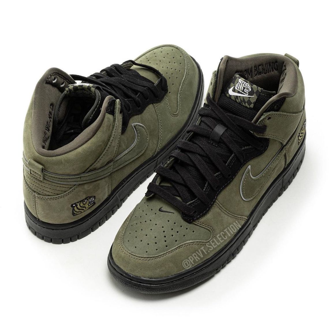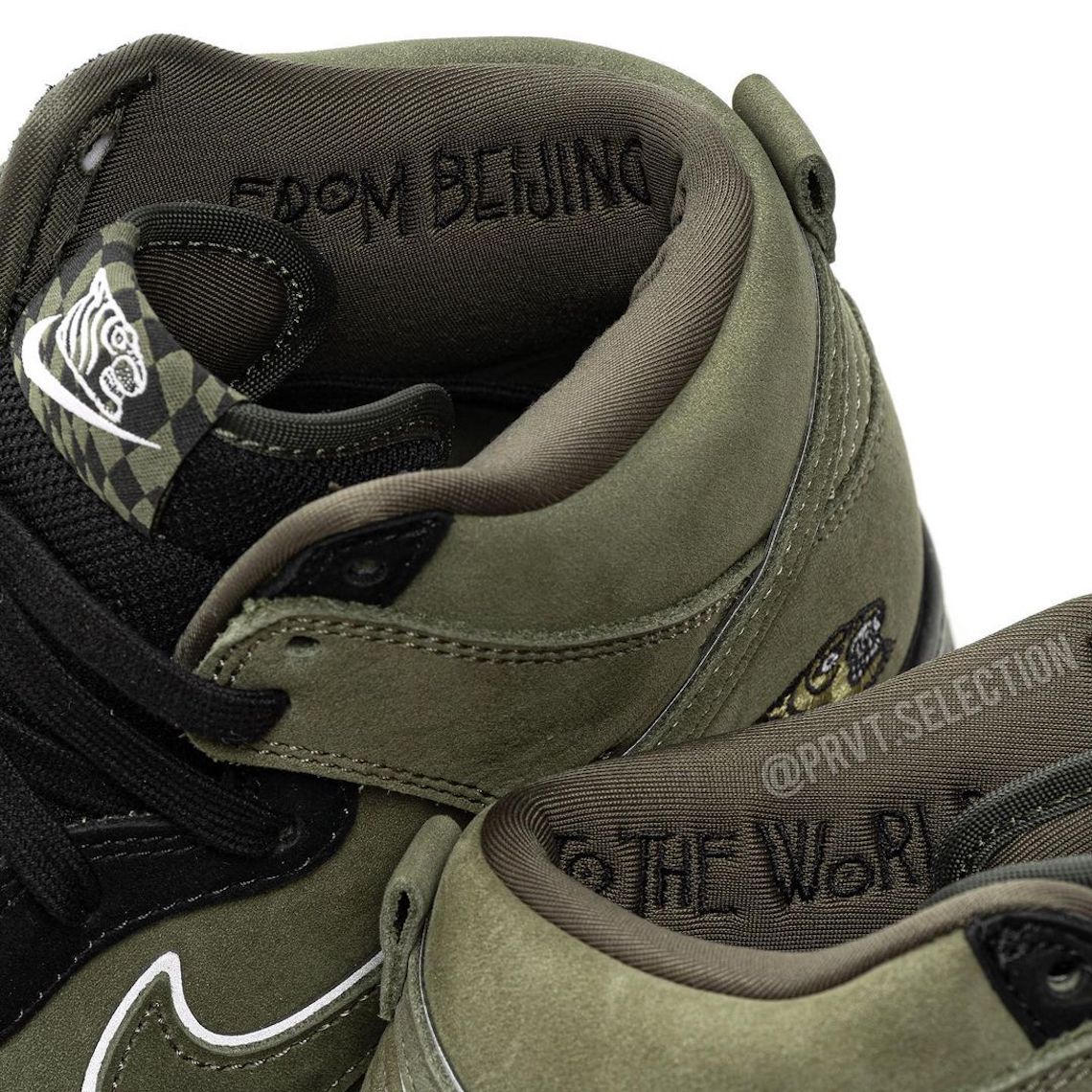Recently, the team lent its creative vision to the Nike Dunk High, a silhouette that’s recently emerged in handfuls of compelling styles courtesy of independent skate shops from across the globe. For its first-ever take on the late Peter Moore’s 37-year-old design, SOULGOODS abandoned the bold, all-over print of its Converse collaboration from May 2021 in favor of an understated olive green and black ensemble. The crew’s “灵魂虎” (Soul Tiger) graphic is embroidered onto the lateral heel, and stamped on both the top of the tongue and sock-liners. Although the all-black mesh tongue (and surrounding panels) and sole units differentiate the Chinese label’s Nike Dunk offering, the most distinguishing factor on the pair is the “FROM BEIJING TO THE WORLD” text placed on the inside of the collar, showcasing SOULGOODS’ national pride and plans to leave its mark on the world.