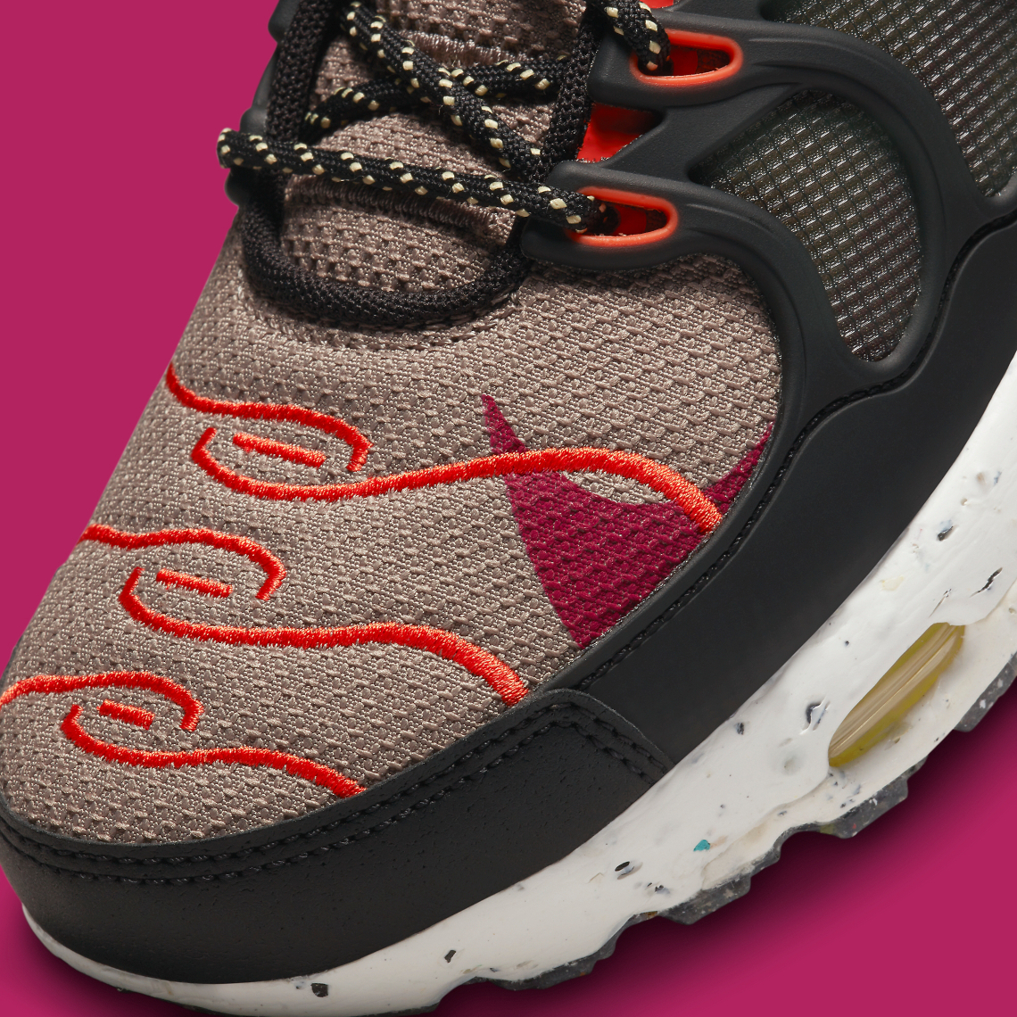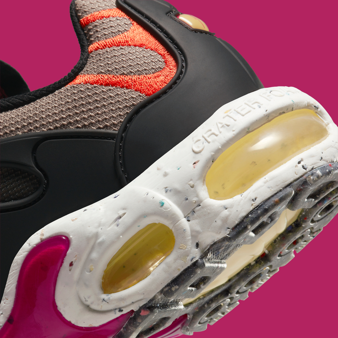 Recently, the updated take on Sean McDowell’s proposition from 1998 emerged in a fall-friendly greyscale ensemble accompanied by vibrant orange and berry-like hues. Crater Foam midsoles underfoot are accompanied by yellow Air Max units that help contribute to an autumnal aesthetic perfect for the trail-inspired re-design. Underfoot, Nike Grind material not only injects a rugged look into the offering, but also works towards the brand’s mission of being a more sustainable company.