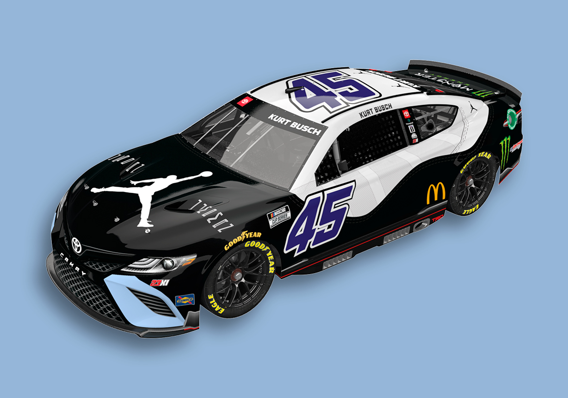 Busch’s last time on the track was in May when he won at the Kansas Speedway. While not discrediting the Las Vegas-native’s driving abilities, it’s important to note that the driver’s Toyota Camry TRD was skinned with an elephant print à la Air Jordan 3 for that race. As a Jordan Brand-endorsed athlete, Kurt Busch has had the privilege of bringing the Jumpman logo to the track, tapping into the heritage of winning of both Michael Jordan and Denny Hamlin, a past Daytona 500 winner and co-owner of 23XI Racing. The latest Air Jordan-inspired update to Busch’s livery makes absolute sense given the vehicle’s number 45, the digits Jordan wore after Game 1 of the 1995 Eastern Conference Semifinals and that appeared on the “Concord” release from 2018. Patent leather mudguards and durable ballistic nylon are “recreated” on the car, with purplish digits landing on the side and top of the car. Lastly, a white-colored Jumpman logo is stamped onto the hood.