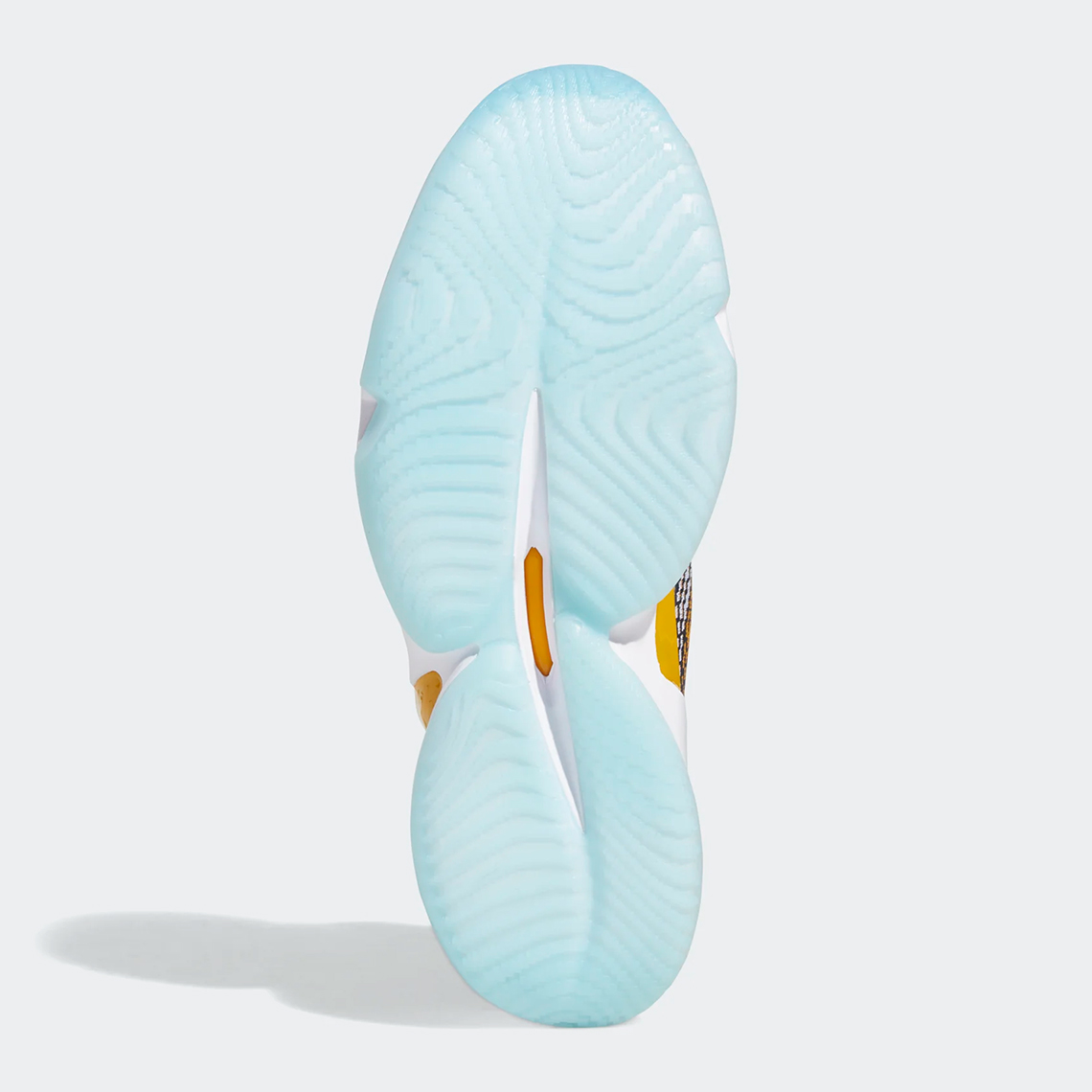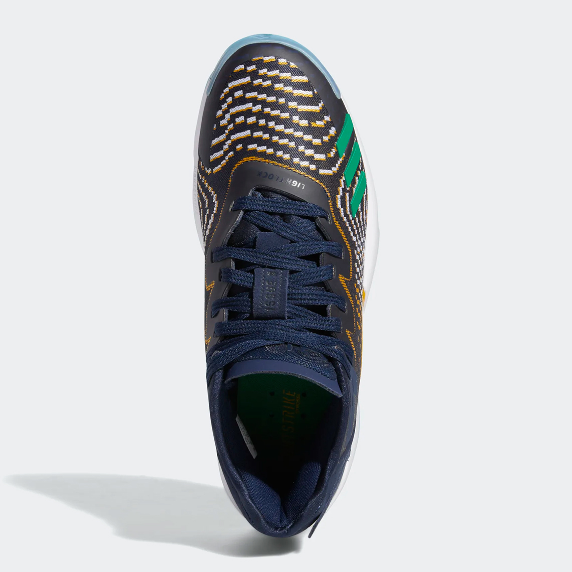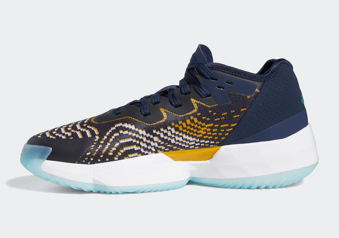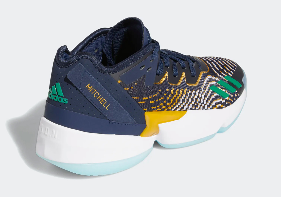 Utilizing the Jazz’s former navy, yellow and green color palette, the silhouette extends a white and “Team College Gold” digitized knit construction across the black base of its LIGHTLOCK upper. The latter half of the silhouette – including its mesh tongue and laces – proffer “Team Navy Blue” hues that further render a clad composition throughout the sock liner as well as the nubuck textile of the heel counter and its suede embossed name tag. Elsewhere, the forefoot and heel’s adidas insignias come clothed in a seldom green sampling while underfoot, the model concludes with a bright white sole unit and icy blue semi-translucent tread.