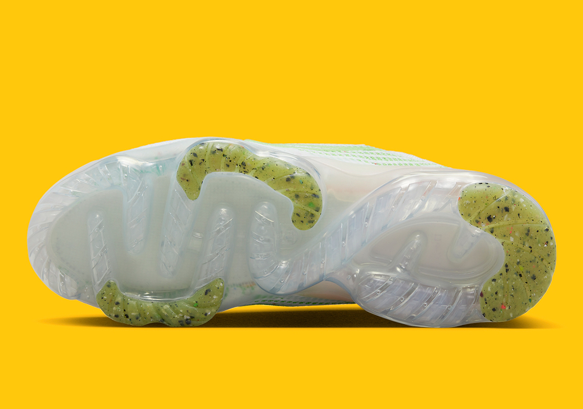 Mirroring the springtime ensemble set forth by the latter two silhouette’s, neon greens come stitched into the crisp white Flyknit upper while its mudguard renders the colorless shade mixed with speckles of multi-color recycled content. Rendering its midfoot Check in an embroidered finish, further samples from the tonal spectrum lay claim to the lace loops attached to the overlay with bright yellow threading whereas ever-so-slight pink laces contrast the more vibrant inclusion of orange amidst its sock liner. Extending jet-black “FEEL LOVE” embroidery along its heel’s pull tab, the semi-translucent heel counter creates a light tan hue that accents the see-through Vapormax bubble underfoot in tandem with its neon grind rubber tread and tucked away burnt orange insoles.