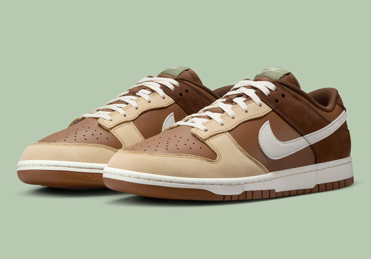 This upcoming Dunk Low is diving head first into the autumnal tones with three shades of brown with varying degrees of strength. It starts with a Sesame, the lightest shade, at the toe-guard and the lace-collar. A slightly darker Light British Tan comes into play on the toe-box and the mid-panels, while the Cacao Wow shade powers through on the heel, interior lining, and outsole. The ubiquitous Sail appears on the Swoosh and midsole, while a light jade completes the Fall fashion look on the tongue.