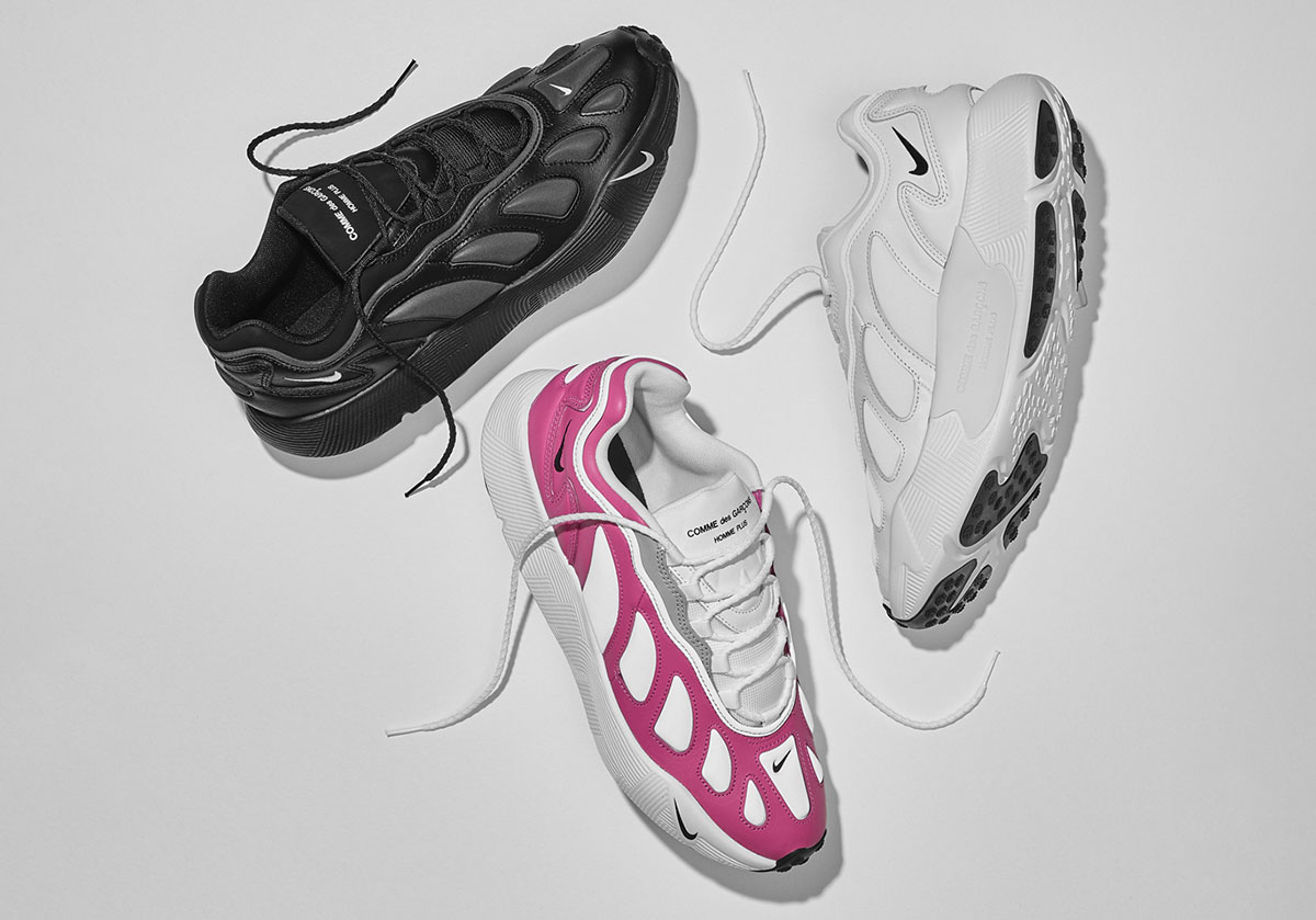True to the initial “leak” and their design language overall, three colorways are on tap for this make-up, spread across all-white, all-black and equally expected pink/white. While CDG’s understated aesthetic touch always inherently shifts focus onto the hardware, here the composition is all the more eye-catching. Spinning off the windowed, retro aesthetics of the Air Max 96 proper, with a far chunkier upper and a cloud-like sole unit underfoot, carrying dense geometric patterns as it delivers an extra cushioned ride.